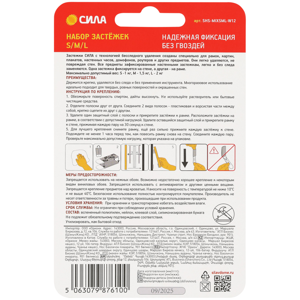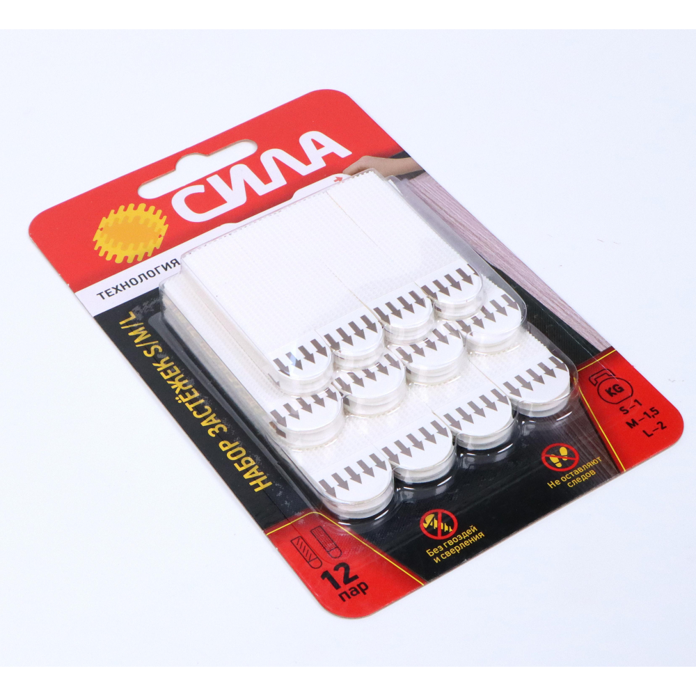 | Назначение | Застежки СИЛА с технологией бесследного удаления созданы специально для рамок, картин, плакатов, настенных часов, домофонов, роутеров и других предметов. Они легко удаляются, не повреждая стен. Все предметы зафиксированные настенными застежкам, легко и без следа заменяются. Одна застежка фиксируется на стене, а другая - на раме. Максимальная нагрузка: S - 1 кг на 1 пару или 4 кг на упаковку, М - 1,5 кг на 1 пару или 6 кг на упаковку, L - 2 кг на 1 пару или 8 кг на упаковку/ |