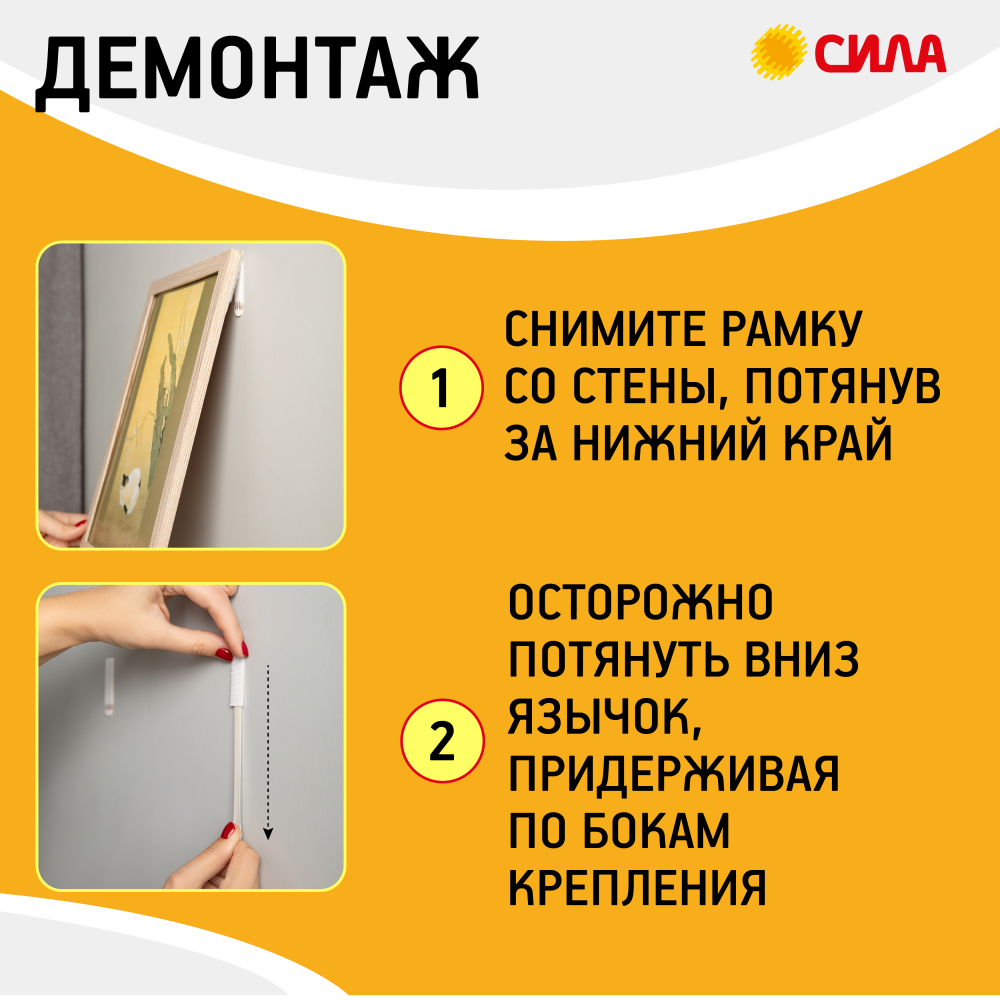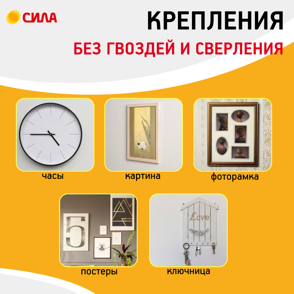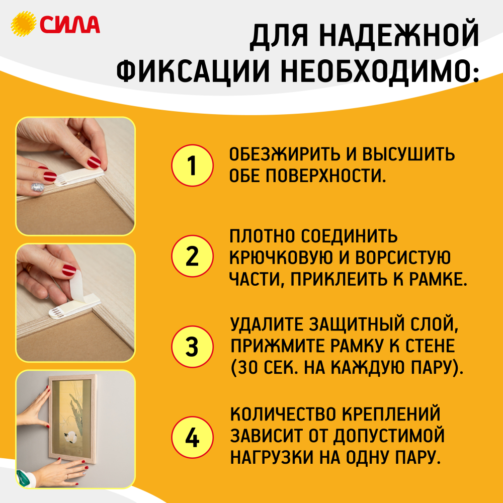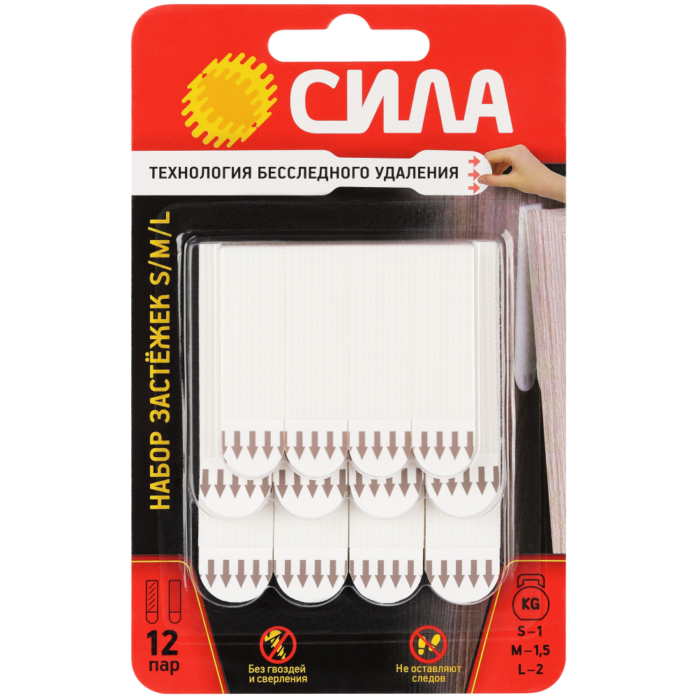 Застежки СИЛА с технологией бесследного удаления созданы специально для рамок, картин, плакатов, настенных часов, домофонов, роутеров и других предметов. Они легко удаляются, не повреждая стен. Все предметы зафиксированные настенными застежкам, легко и без следа заменяются. Одна застежка фиксируется на стене, а другая - на раме.Максимальная нагрузка: до 4-х кг на 1 пару. В упаковке 12 пар застёжек.